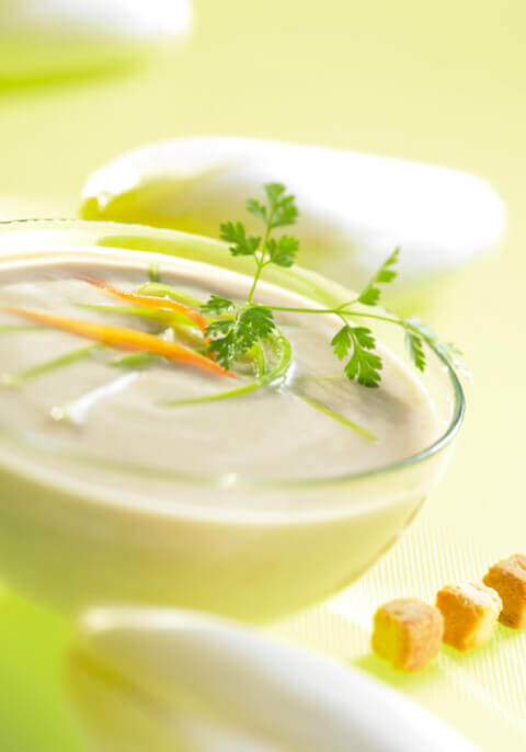 7 Kg d’endives 2 Kg de poireaux 2 Kg de carottes 1,5 L de crème U.H.T 0,750 Kg de beurre 5 L de lait 0,750 Kg de farine 0,08 Kg de sucre semoule 10 L de bouillon de volaille reconstitué 1 botte de cerfeuil P.M. sel P.M. poivre 1 Kg de croûtons nature