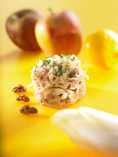 laver, essorer et émincer les endives (1 cm environ) égoutter, rincer et assaisonner de mayonnaise le céleri couper le jambon en dés laver et couper les pommes en cubes, y ajouter le jus de citron ajouter l'ensemble des ingrédients dans les endives, vérifier l'assaisonnement et rehausser d'un trait de vinaigre de cidre dresser et décorer de persil plat